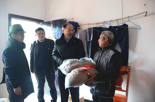 在军屯村易地扶贫集中安置点幸福苑,万明察看了我校驻村干部的办公室,了解了扶贫工作开展的主要情况,察看了村委会建档立卡户档案的工作情况。并看望了居住在此的贫困户,为他们送上200余件我校艺术学院朱明弢老师以拍卖自己创作的油画所得换置的御寒冬衣,并与他们亲切交谈,关心他们的生产生活情况,仔细询问帮扶措施的落实情况。“这衣服既保暖又实用,天再冷也不用担心了,谢谢你们。”贫苦户领到新棉衣后,个个喜笑颜开,都说穿上这些棉衣身暖心更暖。